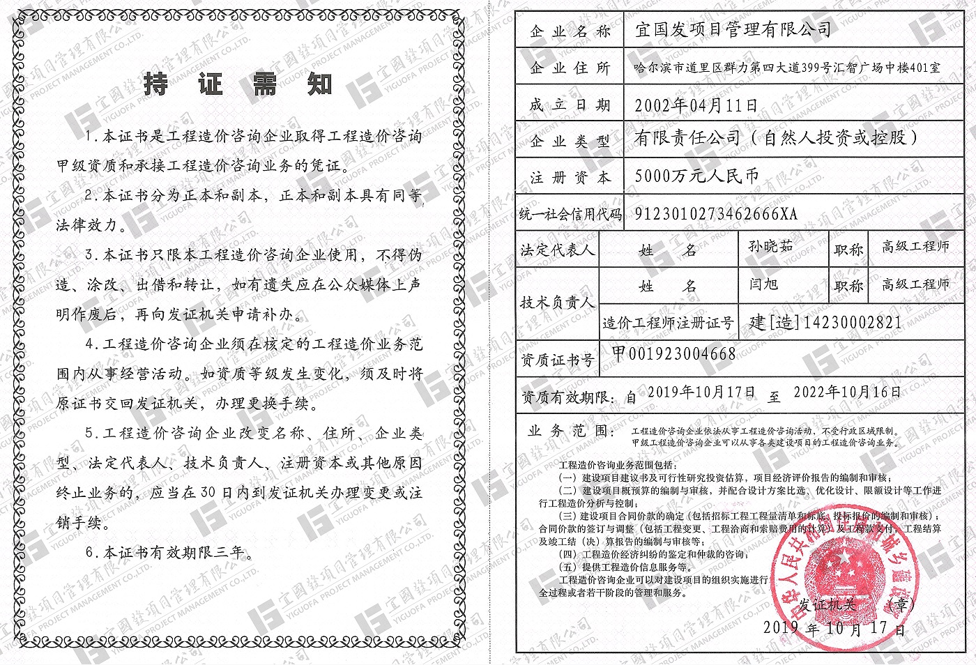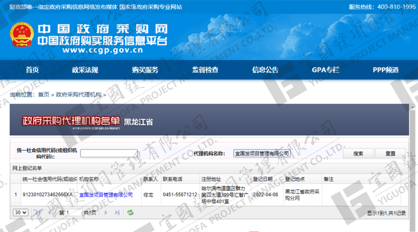 宜國發項目管理有限公司(原名黑龍江國發項目管理有限責任公司)成立于2002年4月,公司注冊資金5000萬元人民幣,具有獨立法人資格。現具備國家住房和城鄉建設部頒發的工程招標代理機構甲級資質,發展和改革委員會頒發的中央投資項目招標代理機構甲級資質、財政部頒發的政府采購代理機構甲級資質,黑龍江省住房和城鄉建設廳頒發的工程造價咨詢企業甲級資質,并已納入全國投資項目在線審批監管平臺工程咨詢單位備案名單、“中國政府采購網”政府采購代理機構名單及“中國國際招標網”機電產品國際招標代理機構名單,且通過了質量管理體系、環境管理體系、職業健康安全管理體系認證。